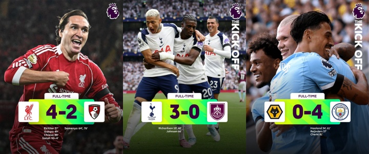08月18日讯 新赛季英超首轮基本结束,传统BIG6的比赛都已经打完,其中利物浦4-2伯恩茅斯、曼城4-0狼队、热刺3-0伯恩利、切尔西0-0水晶宫、阿森纳1-0曼联。