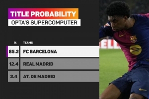 开云官方网站-Opta预测西甲夺冠概率:巴萨85.2%、皇马12.4%、马竞2.4%